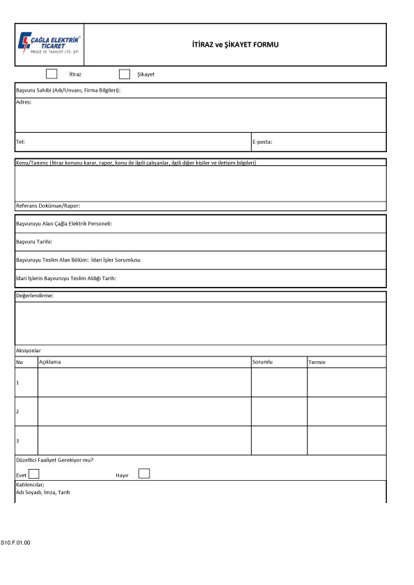 S10.F.01.00 İtiraz ve Şikayet Formu