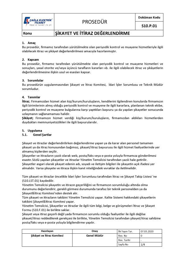 S10.P.01.00 Şikayet ve İtiraz Değerlendirme Prosedürü